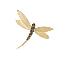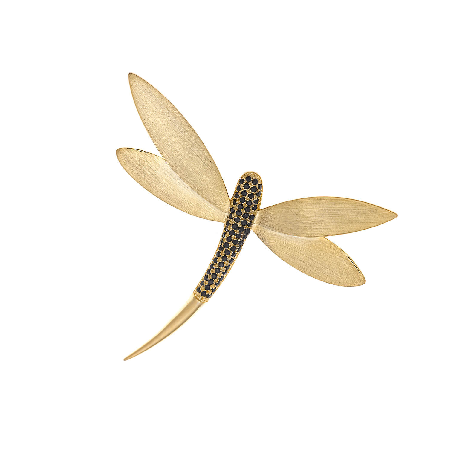Broche en plata de primera ley (925) chapado dorado, libélula mate con circonitas negras.