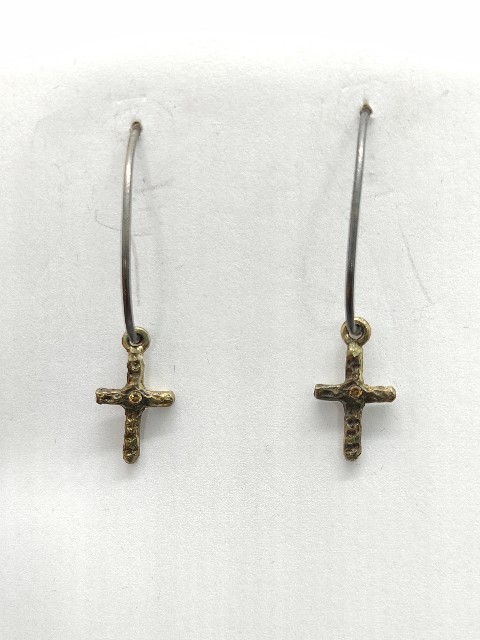 Pendientes de plata de primera ley (925) de gancho, baño amarillo y oxido. Circonita de color en el centro de la cruz.