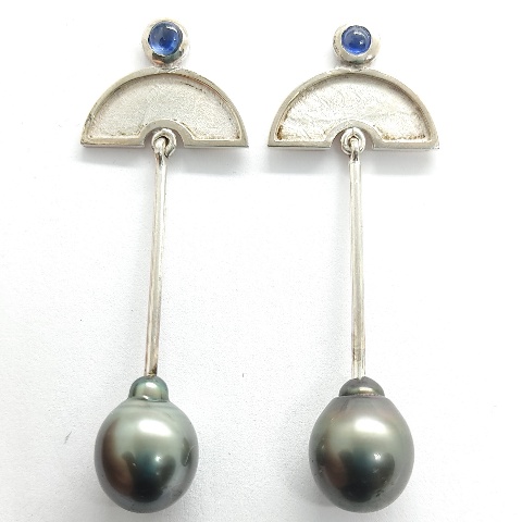 Pendientes plata de primera ley (925) zafiro azul en cabujón y perla de Tahití.