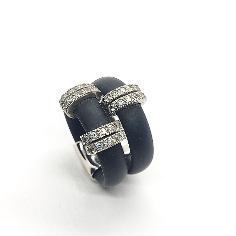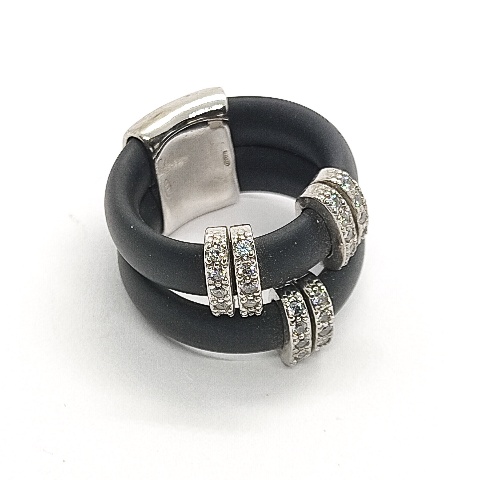 Sortija plata de primera ley (925) caucho negro y circonitas blancas.