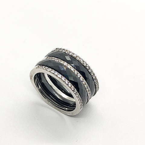 Sortija plata de primera ley (925) circonitas blancas y cerámica.