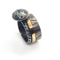 Sortija plata de primera ley (925) y doblete con oro amarillo de primera ley (750/1000), envejecida, topacios y zafiros azules.
